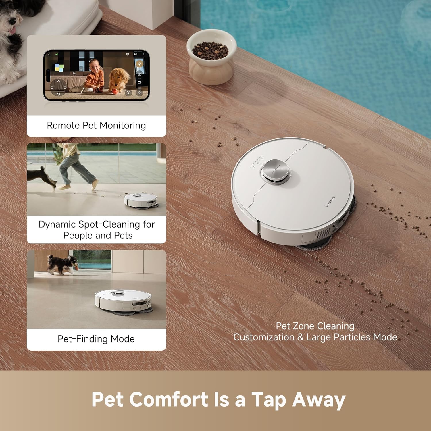 • Designed for Pet Owners in Mind: Enjoy a pet-friendly home with personalized cleaning tailored to your space. The robot vacuum detects objects around pets, like food bowls and litter boxes, allowing you to choose to clean around them or avoid them. Stay connected with your furry friends while away using real-time video calls and two-way voice interaction.