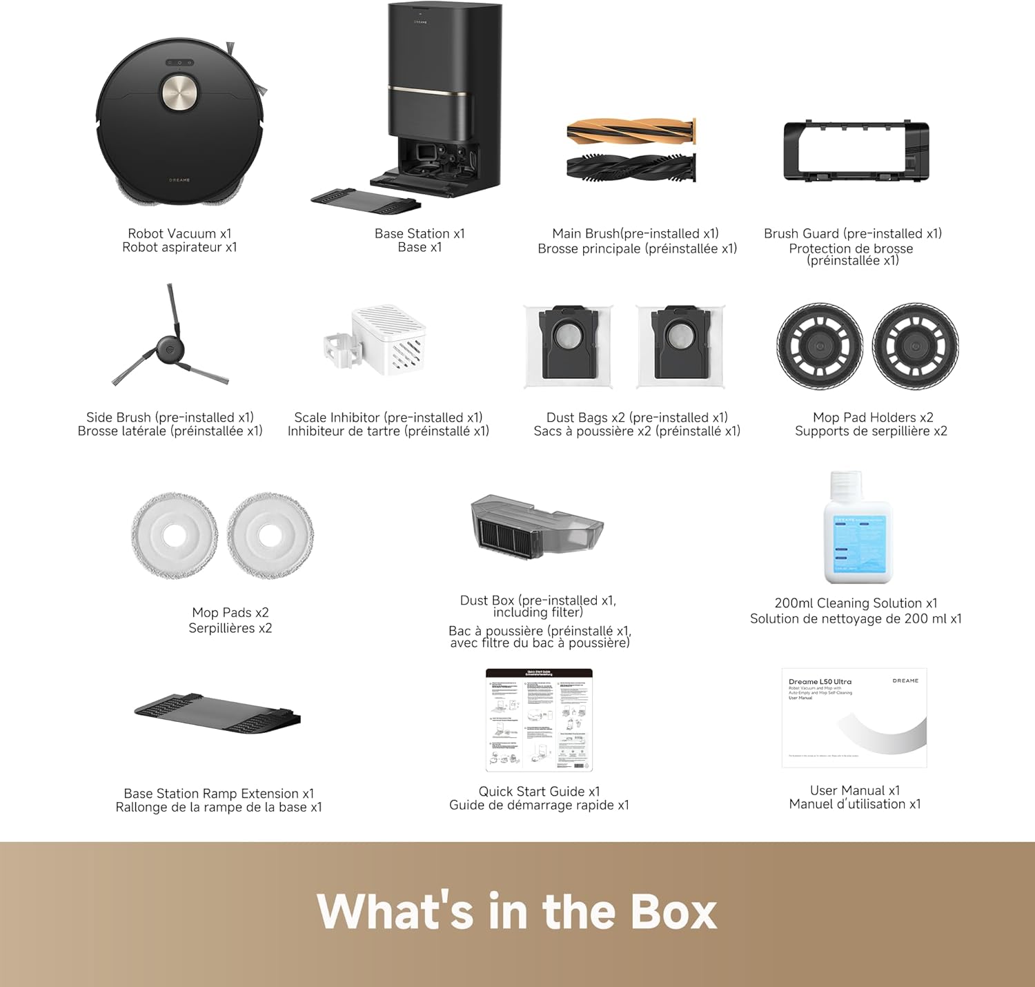 • All-in-One PowerDock Convenience: Benefit from the dock’s effortless maintenance. Skip manual dust bin emptying for up to 100 days, rinsing mop pads with hot water from all the dirt, or drying them. L50 Ultra also refills solution and water for mopping and auto-washes its board, creating a hands-free post-cleaning routine.