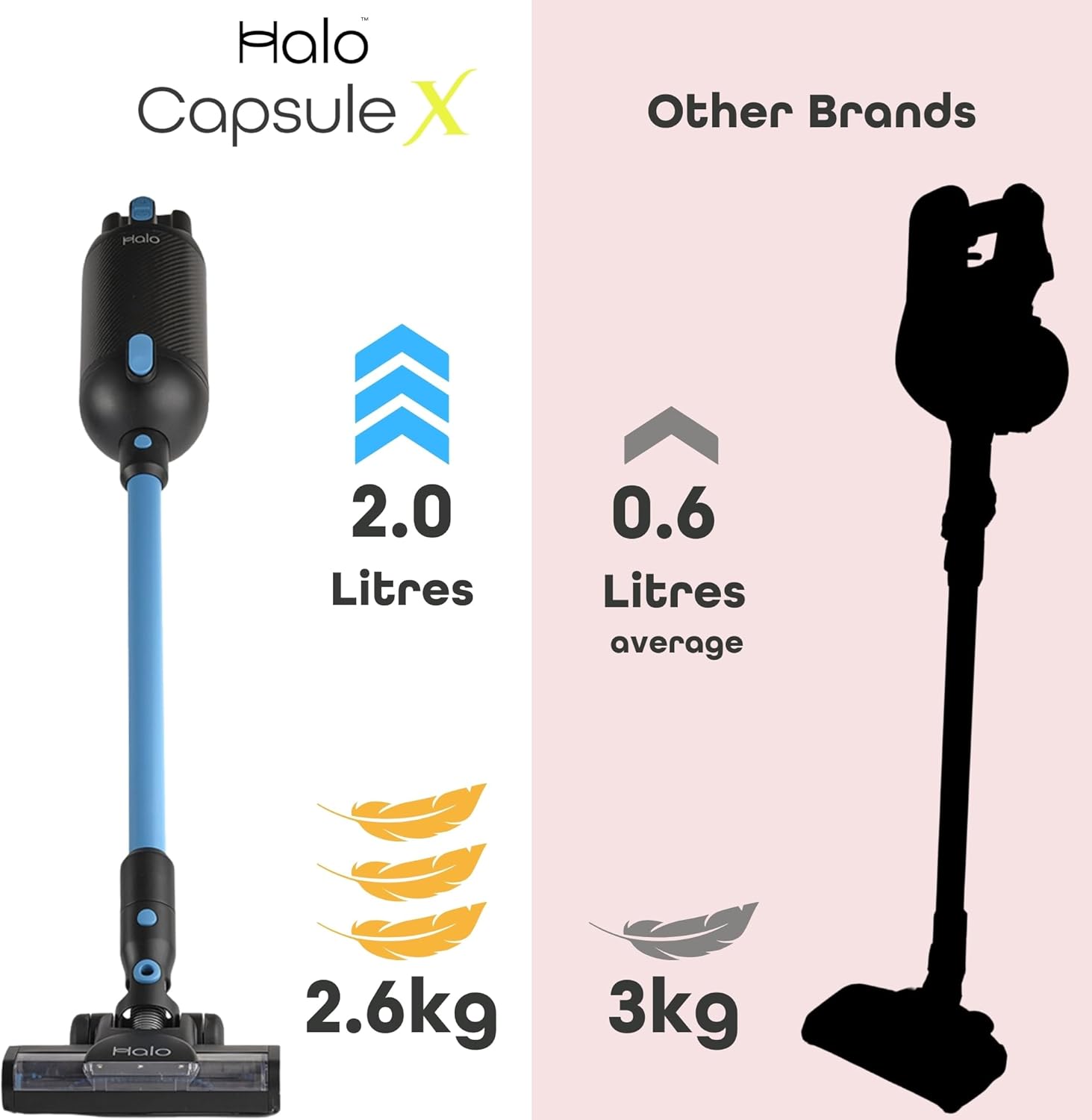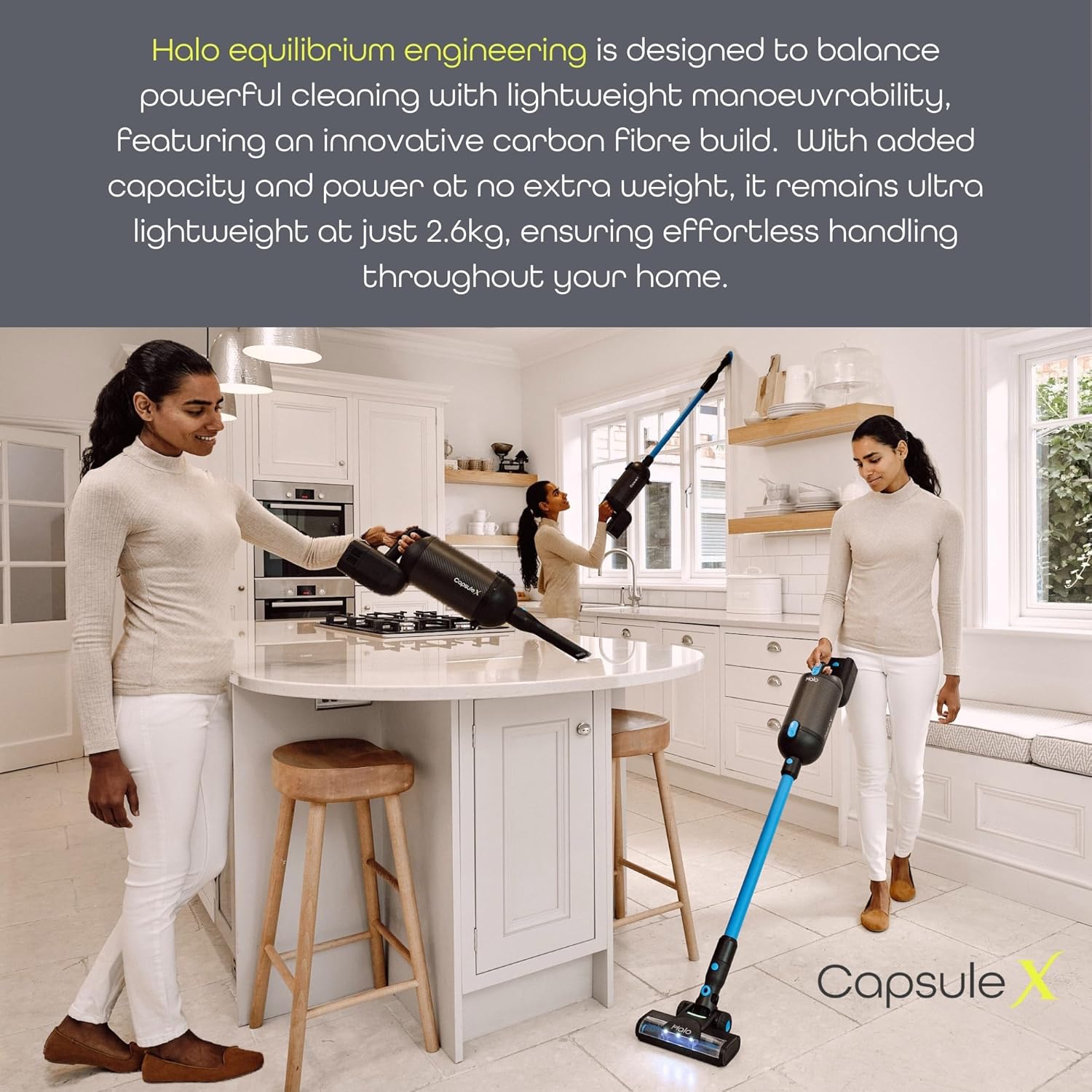 • ULTRA LIGHTWEIGHT CORDLESS VACUUM CLEANERS: With its carbon fibre construction the Halo Capsule stick vacuum cleaner weighs in at just 2.6kg – taking the hard work out of vacuuming. New & improved handling with Halo Equilibrium Engineering for perfect balance and handling