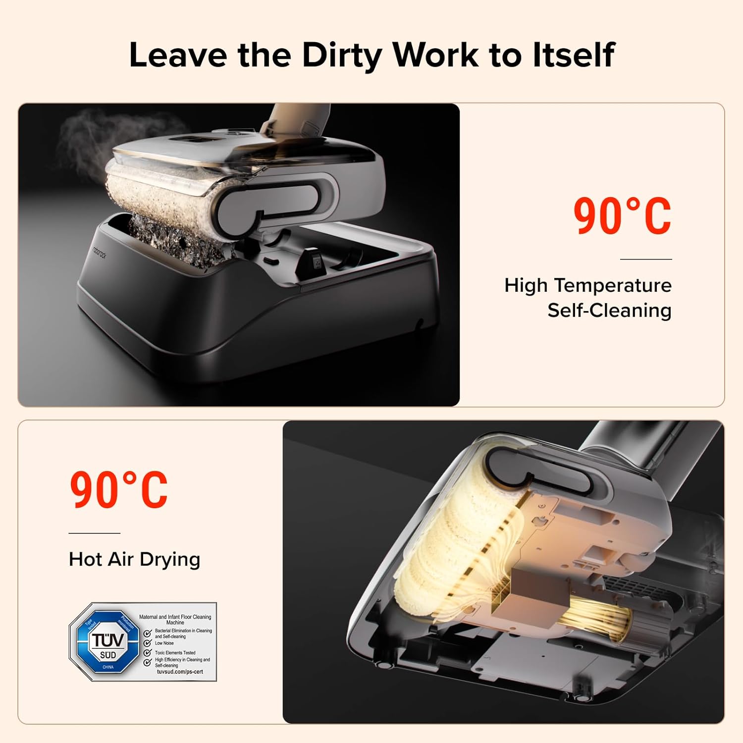 • 90 °C High Temperature Self-Cleaning: No more dirty mop heads! After cleaning ceramic or concrete floors, the 90 °C High Temperature Self-Cleaning system melts away gunk, while hot air drying keeps the roller brush odor-free. Great for high-traffic areas like kitchens and entryways