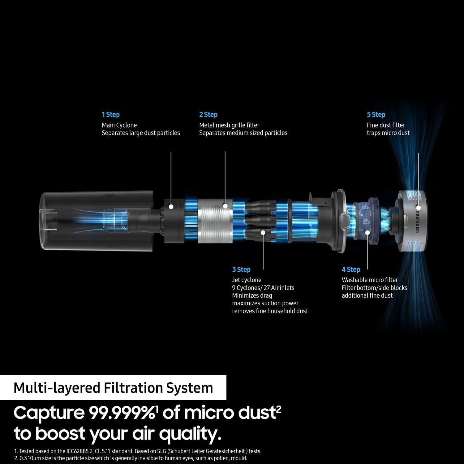 • Multi-layered Filtration System – includes an ultra-fine dust filter that captures 99.999% of micro dust, like pollen and mould